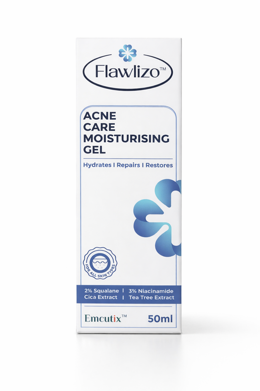 Feature Details Product Name Flawlizo Acne Care Moisturising Gel Brand Emcutix Pack Size 50ml Skin Type All Skin Types (Especially Oily & Acne-Prone) Main Ingredients Niacinamide, Squalane, Cica Extract, Tea Tree Extract Purpose Acne Care, Hydration, Oil Control, Skin Repair Texture Lightweight, Non-Greasy Gel Sale -