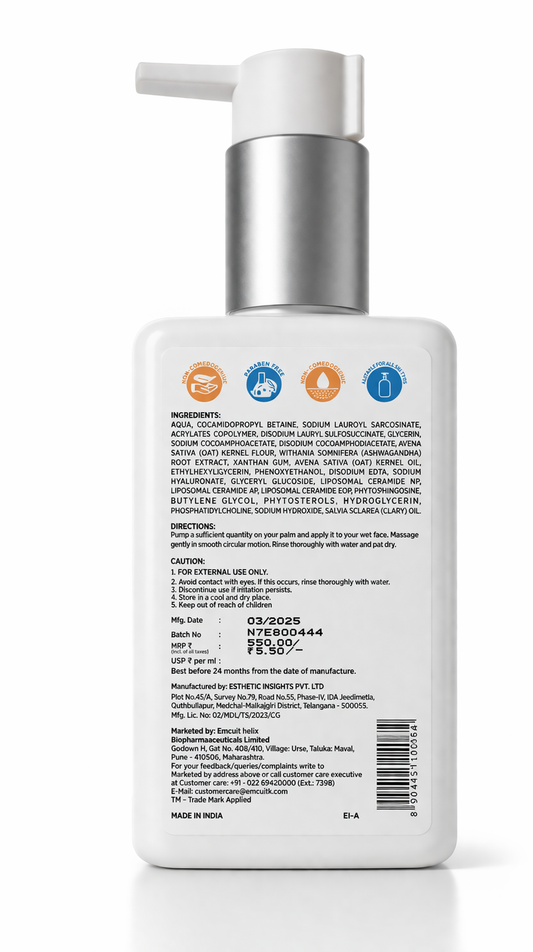 Feature Details Product Name Aqua Oat Hydrating Face Cleanser Brand Emcutix Pack Size 100 ml Skin Type Dry to Very Dry, Sensitive Skin Main Ingredients Colloidal Oatmeal, Liposomal Ceramides, Ashwagandha Root Extract, Clary Sage Oil, Sodium Hyaluronate Purpose Gentle Cleansing, Hydration, Skin Barrier Support Texture Creamy Cleanser Fragrance Level Mild Sale -