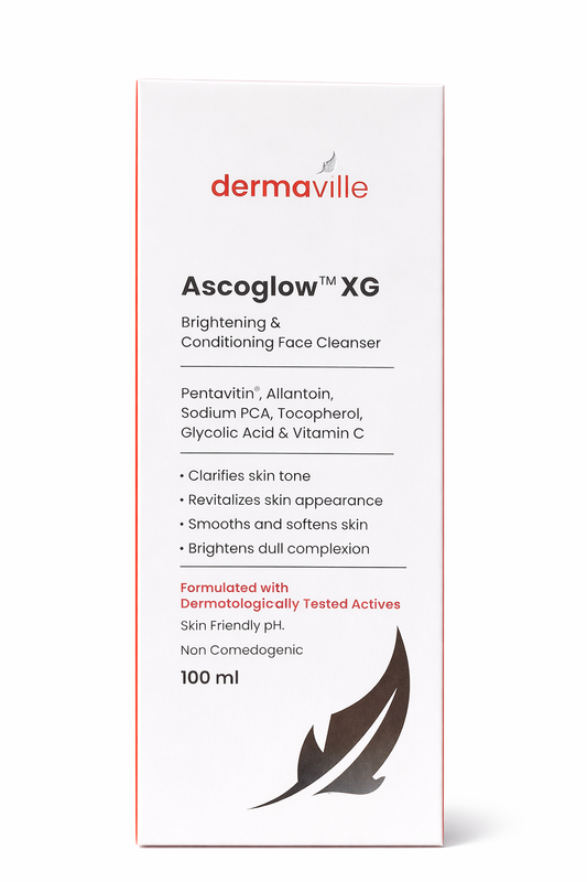 Feature Details Product Name Ascoglow™ XG Face Cleanser Brand Dermaville Pack Size 100ml Skin Type All Skin Types (Including Dull and Uneven Skin) Main Ingredients Glycolic Acid, Vitamin C, Pentavitin, Allantoin, Sodium PCA, Vitamin E Purpose Brightening, Hydrating, Skin Renewal Price Rs. 699 (example) Sale -