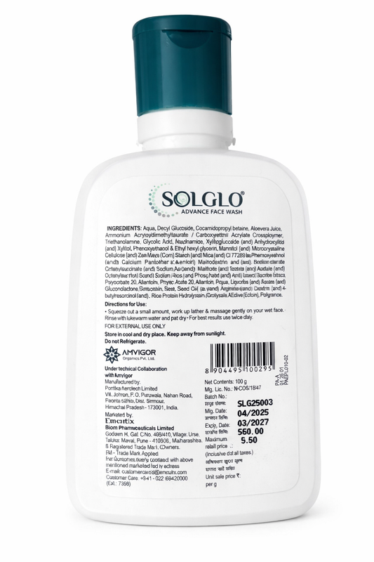 Regular price Rs. 559.00Regular priceUnit price Rs. 5.59 / per gMRP. 560.00Sale price Rs. 559.00SOLGLO Advance Face Wash is designed to cleanse your skin without stripping its natural moisture. With a skin-friendly pH formula, it keeps your skin fresh, balanced, and comfortable after every wash.