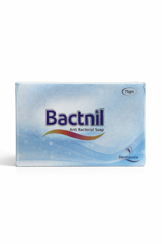 Feature Details Product Name Bactnil Soap Brand Dermazone Pack Size 75g Skin Type All Skin Types, Oily & Acne-Prone Main Ingredients Silver Oxide, Triclosan, Olive Extract, Shea Butter, Wheat Protein, Milk Protein Purpose Antibacterial Protection, Skin Nourishment Price Rs. 477 Sale -