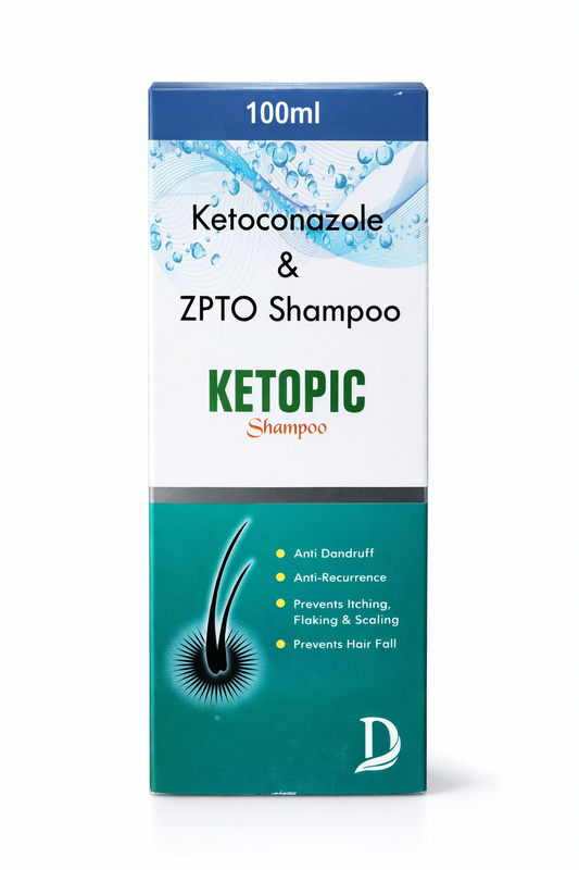 Regular price Rs. 253.75Regular priceUnit price Rs. 2.54 / per mlMRP. 243.75Sale price Rs. 253.75Ketopic Shampoo combines the clinically proven antifungal agent Ketoconazole with Zinc Pyrithione (ZPTO) to effectively treat dandruff at its root cause. This powerful anti-dandruff shampoo provides long-lasting relief from itching, flaking, and scaling while preventing dandruff recurrence. Its gentle yet effective formula helps maintain a healthy scalp and reduces hair fall caused by dandruff.