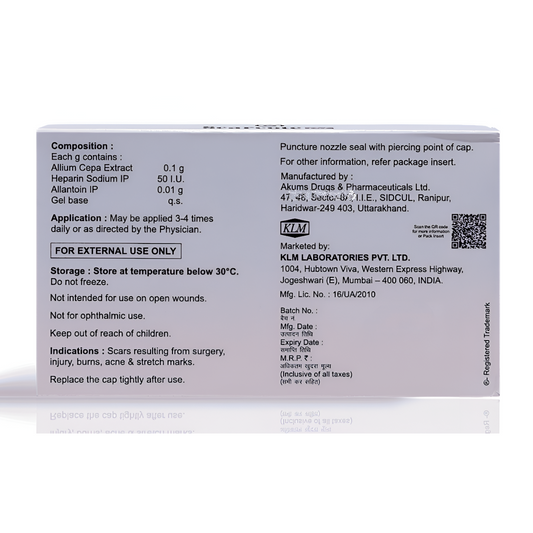 Pack Size 15g Main Ingredients Allium Cepa Extract, Heparin Sodium, Allantoin Application Topical (External Use Only) Purpose Scar Reduction and Skin Healing Texture Non-Greasy Gel Sold out