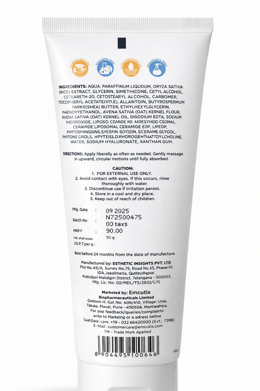 Feature Details Product Name AquaOat Moisturising Cream Brand Emcutix Skin Type Dry to Very Dry, Sensitive Skin Main Ingredients Colloidal Oatmeal, Liposomal Ceramides, Vitamin E, Rice Extract, Sodium Hyaluronate Purpose Deep Hydration, Skin Barrier Repair, Soothing Care Texture Rich Cream Fragrance Level Mild Sale -